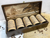 В подарочный набор входит пять элитных сортов свежеобжаренного кофе в зернах 100% арабики с островов тихого океана и Карибских островов по 100 гр в фирменной шкатулке из натурального дерева. Размер 39х15х9 см.: