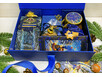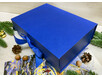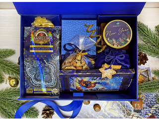 8. Коробка из премиум картона на магните с лентой и новогодним оформлением. Цвет синий. Размер 28х20х9 см.
