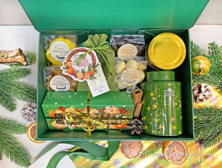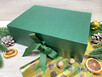 8. Коробка из премиум картона на магните с лентой и новогодним оформлением. Цвет зеленый. Размер 28х20х9 см.