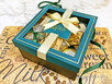 9. Зеленая коробка из плотного картона с прозрачным окном и декором. Размер Б 19х19х9 см.